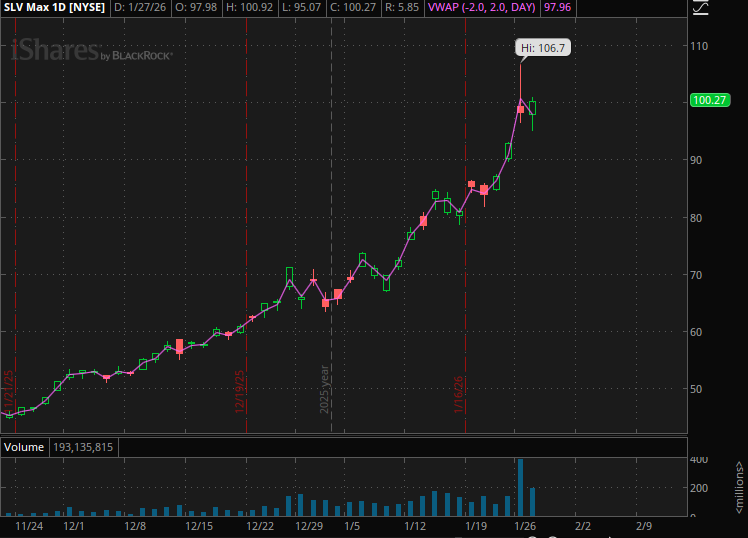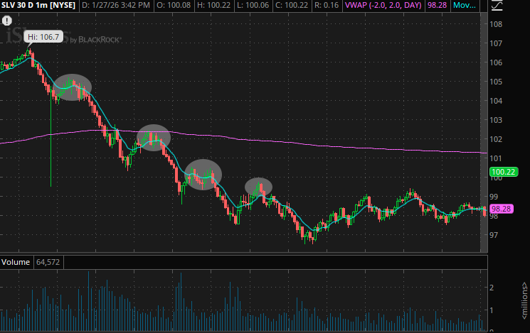 They see this hypothetical bounce to $98 and think “see, I was right. Silver IS coming back.” And instead of selling, perhaps they even buy some more, not realizing how impactful that daily volume was. There are thousands of Uncle Joe’s who are going to create selling pressure as they come back to breakeven (or close to it).